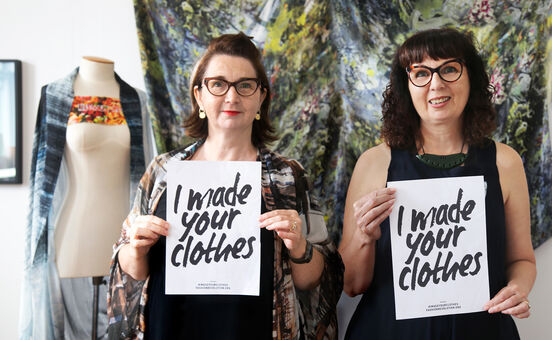 Kim Fraser and Deborah Crowe (R-L) of fashion label Fraser Crowe with a project for Fashion Revolution Week 2018. Photo courtesy of Deborah Crowe