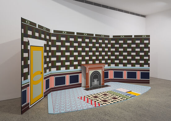 In recent years, Esther Stewart has made paintings and sculptures using geometric designs that, while deriving from modernist abstraction, also reference the ornamental trappings of architecture and domestic interiors such as awnings, balustrades, lattices and tiles; marble veneers; patterns on carpets, rugs or wood panelling. Home decorating has associations with the feminine and Stewart uses this domestic vernacular to personalise her abstract language. Often blurring boundaries between art, architecture and design, such works also toy with being functional, like her recent sculptures that double as display screens for paintings, and her patterned carpets that can be displayed hung on the wall.