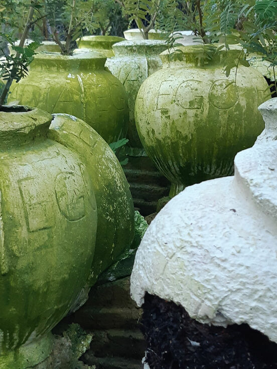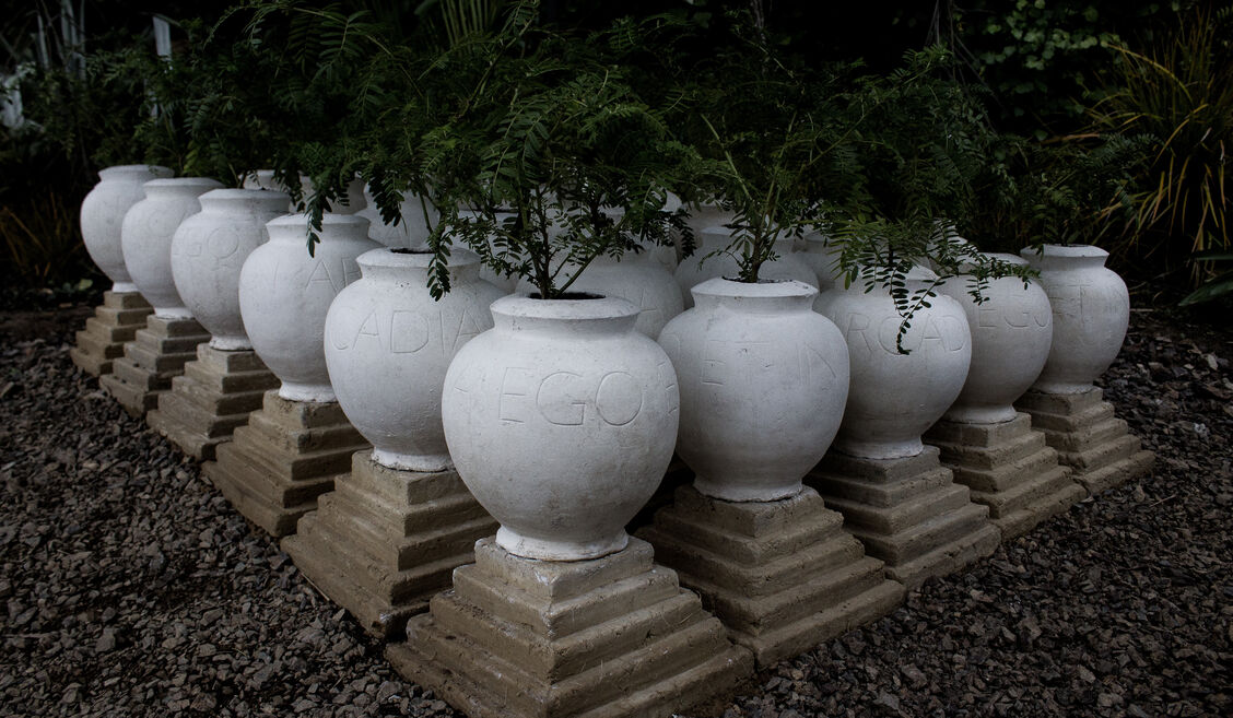 The title of Atkinson’s work reinforces this, appropriating a translation into English of the title of the memento mori painting Et in Arcadia ego (1637—38) by classical French Baroque artist Nicolas Poussin. Poussin’s work depicts a pastoral scene with several shepherds in discussion around a tomb. The painting has multiple potential meanings and has come to be seen as both a reflection on death and an allegory for the role of painting. Thematically, then, it is akin to Atkinson’s focus on the life of her plants and the clay urns’ eventual return to the earth. The urns are each adorned with the words ‘Et in Arcadia ego’. However, on the one situated at the front of the group only the word ‘ego’ can be seen, turning it into a statement on the conscious, thinking subject, on self-esteem and on personal identity. At one point in the video, the piece of this urn inscribed with text tumbles off, the moisture from the dirt finally breaking open the vessel. As the video continues, the earth and plant roots hold the urn’s shape, the memory of their recent encasement retained until the ngutu kākā mā can be planted out into a bigger patch of soil.