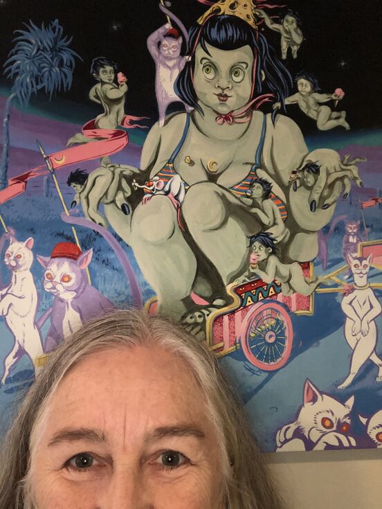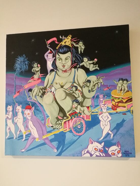 I have a painting which hangs on the wall above my shoulder where my home office is. It is by Erin Forsyth and is titled ‘Gristelina Goes to Market’. I purchased it in 2015 at the launch of the All Fresco Street Art Festival on K Road.