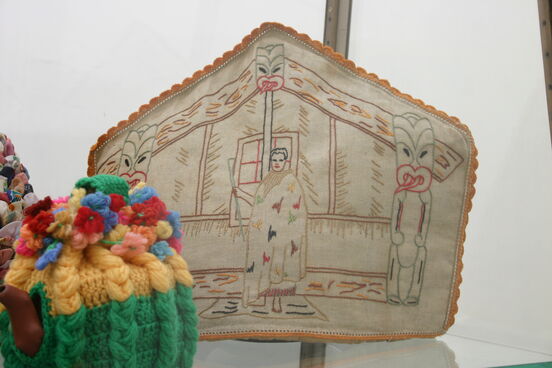 For tea in the parlour, and when entertaining visitors, a housewife would present a fancier cosy, embroidered, appliqued, crocheted, patchworked - even made from kangaroo skin. They must have been talking points at the table, a source of compliments as well as humour. Cosies were often colour co-ordinated to match a hostess's best china. They were integral to an elegant teatime spread of both home-made embroideries and home-baked treats, showing the range of a woman's accomplishments, and harking back to craft traditions in our countries of origin. They are humble emblems of pākehā colonial culture, and relics of the former lives of women.