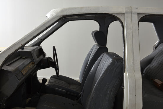 Unlike many of Hayward’s previous works, this sculpture is not an exact replica of the original. Hand-carved from wood and painted, the interior is a feat of meticulous imitation and craftsmanship. The exterior, however, is not – it is scrappy and lumpen, roughly pieced together from mismatched retro hardboard panels. Rather than representing a real car, dendrochronology conjures the idea of a car, the fleeting memory of a car – the cavity of a car as a site for imaginative play and magic.