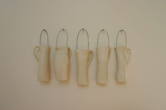 The themes of excess and depletion continue in the works that make up Lucas's installation, DIP. The works are built upon the dual premise that nothing can be done in the environment without it having some impact (good or bad), and that nothing can be viewed in isolation without connections to the already seen or known. Lucas mines the subject through the subtle adaptation of domestic kitchenware. Punctured surfaces, thick viscous glazes, and handles made from fence wire are combined with visible signs of wear and tear - a bottle shows the patchy residue of water leakage, a funnel retains the traces of the materials once poured through it. Simple alterations to the scale of certain objects create strangely ambiguous hybrids - a coal bucket, for instance, vaguely resembles a sheep carcass, a pram, and a mechanical digger.