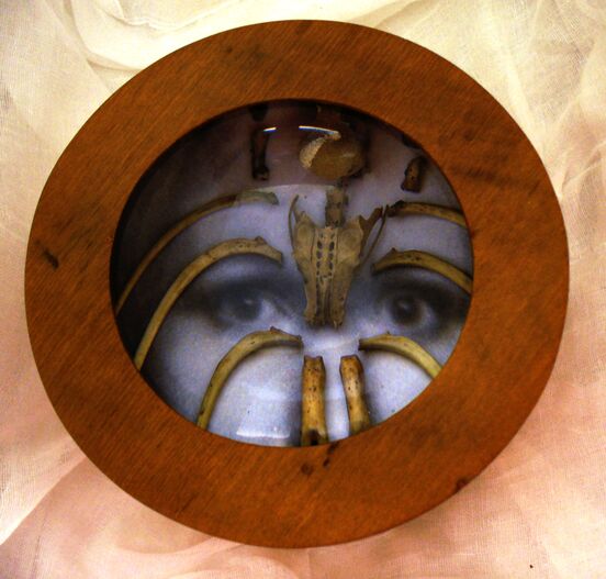 In this installation, Wellington based object maker and contemporary jeweller, Vaune Mason, elevates the remnants of non-human lives. She says that a tendency to focus on minute things has led her to imagine "a whole world of memories untold in the lost lives of common insects, birds and animals." The viewer is encouraged to see these constructions as Mason does; not as macabre constructions, but as testament to the innumerable, yet precious, untold lives of small animals everywhere.