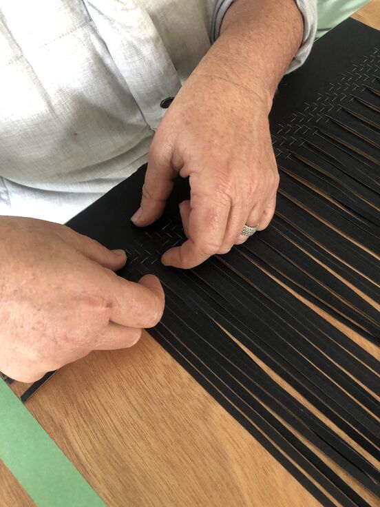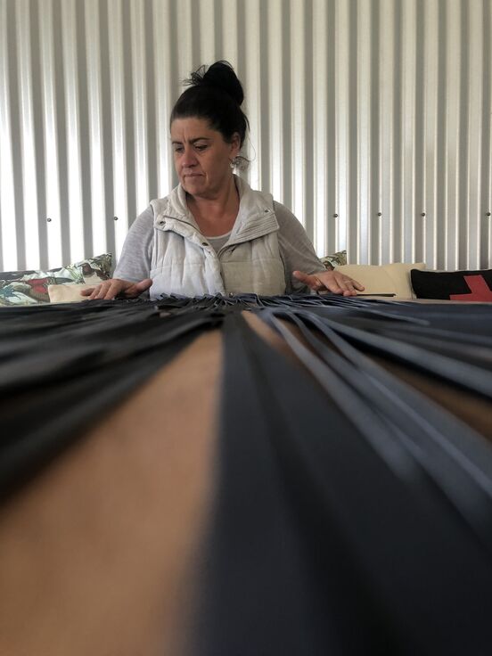 In one of my photos is the first completed section of a kahu raranga konunu (black woven cloak); based on a kahu raranga puputu, thought to be the oldest styled Māori rain cape in existence. It is plaited in the same way as a whāriki (floor mat), and the main pattern of the weave across the surface is torua whakatakoto, a horizontal twill pattern that passes over and under two strips at a time. My interpretation will be constructed in two panels displaying a whati raranga and will have three decorative fringes top, middle and bottom.