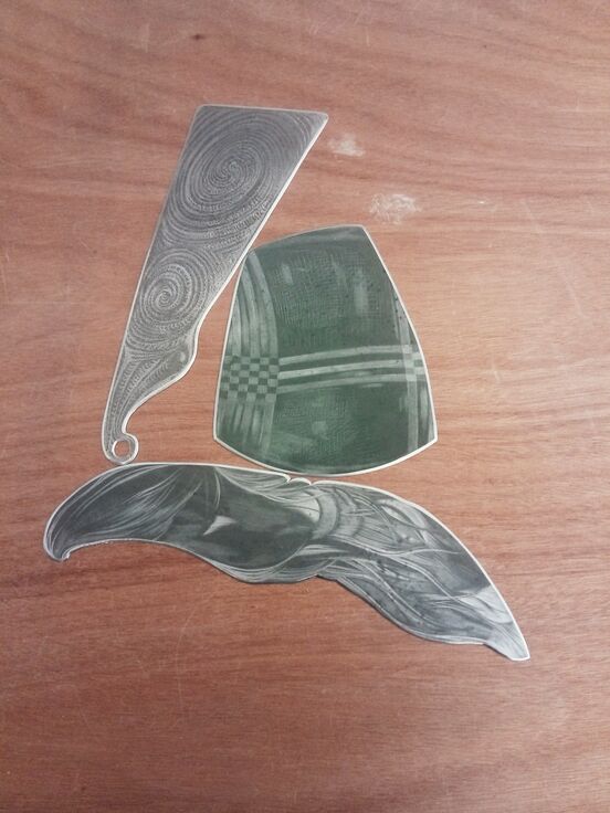 Old, scratched and upcycled plates have been reshaped and made to look over-handled… made to look like they carry history. They are honouring the past, reaching ever more forward to where we stand today. Dark shades of sap green give the feeling of pounamu (greenstone), and dark sepia brown combined with bone coloured chine-collé paper allude to whalebone adornment. Elements of blood red feature as a reference to Hei tiki; in human form. It is often the material culture that we leave behind, personal items, fragments of history, dense with memory and stories once told.