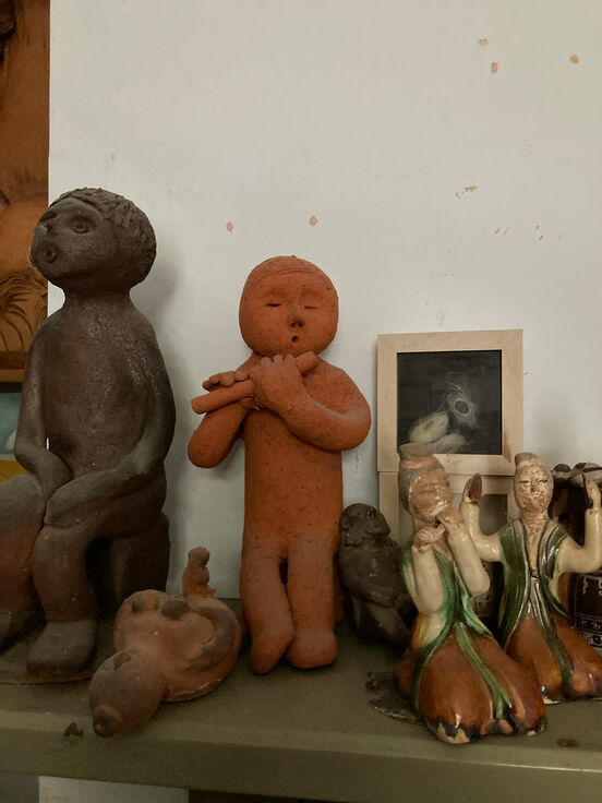 Painting by Wailin Elliott with a carving by her husband, Tom Elliott, above. Photograph by Kathryn Tsui.