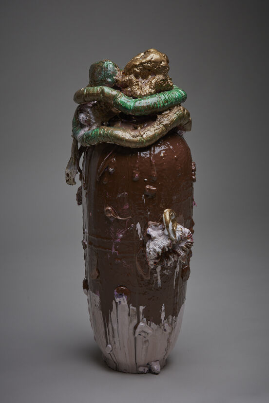I feel this in the tottery Grapesicle (2020), where what look like wounds become alluring. I feel it in The Mittens (2020), which seems to say ‘I’m a mess, but I’m my mess’. And I feel it especially in the anti-monument that Fooks calls Chocolate Hills (2020), which is as hilariously arresting, in a white-cube context, as a sculpture with a child wodged into it. A poor chair nobly shoulders a poop-coloured chest of drawers, whose sea-shelled escutcheon nonetheless emanates a touching sense of pride. And the whole top-heavy ridiculous arrangement projects an unexpected dignity, as of someone who dressed up too much for a party but is determined to stick to their guns.
