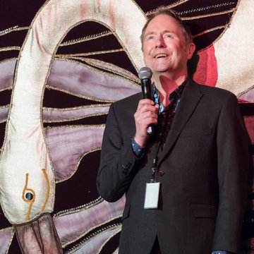 The late Bill Gosden in front of the curtain. Photo: courtesy New Zealand International Film Festival.