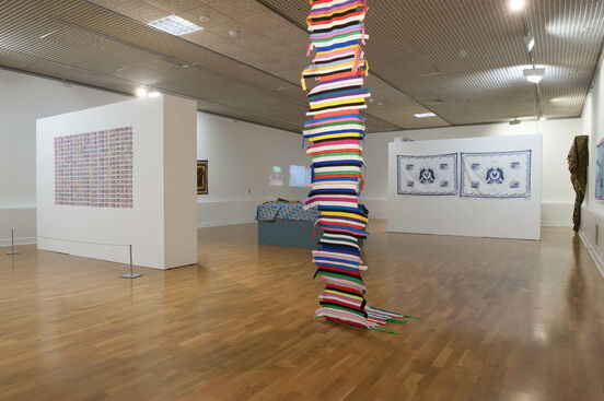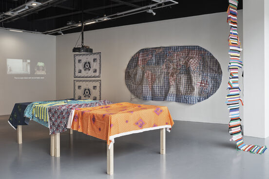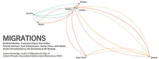 Figure 5. Migrations exhibition installation view National College of Art & Design Gallery, Dublin, Ireland (April 30 – May 29, 2015). Featuring work from Toril Johannessen, Godfried Donkor, Mr Somebody & Mr Nobody, Dan Halter, Francoise Dupre