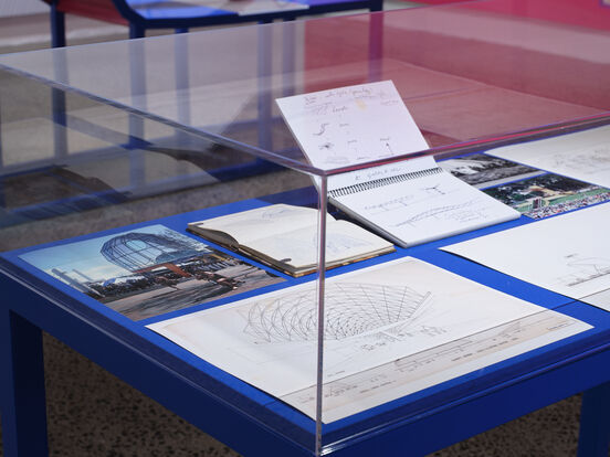 Photographs and notebooks tracing the design of Otara Town centre exhibiting in KOHA. Photograph by Sam Hartnett.