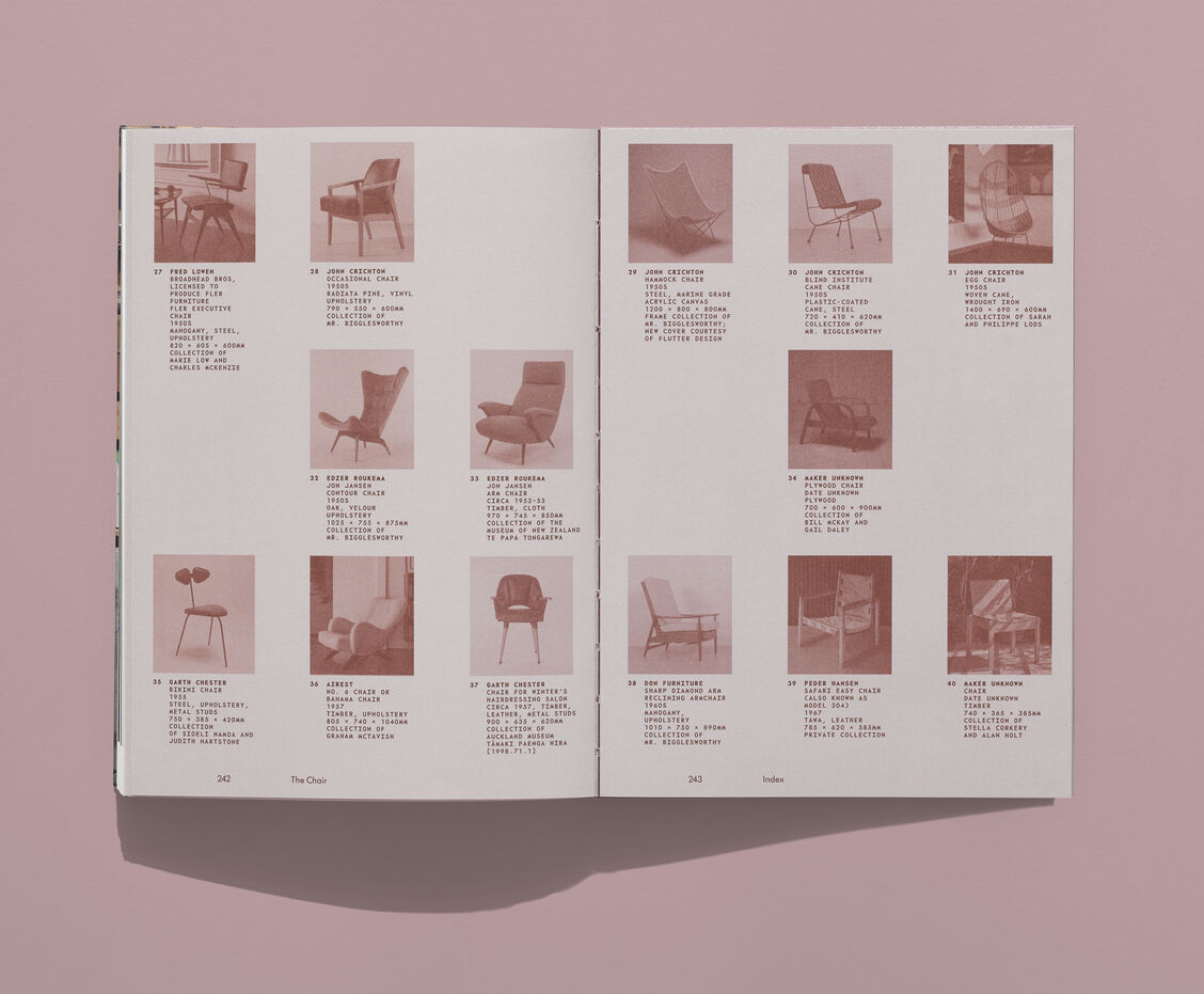 Designed by Inhouse, The Chair book features new writing on each of the 110 chairs included in the exhibition and photographs taken across the country: together telling a story of design and making in Aotearoa.