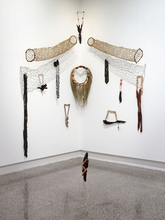 Neke Moa (Ngāti Kahungunu ki Ahuriri, Kāi Tahu, Ngāti Porou, Ngāti Tūwharetoa) is an adornment and object artist working predominantly with found materials collected from te taiao. Her practice expresses a commitment to maintaining and uplifting mana motuhake (self-determination) through whakawhanaungatanga, wairuatanga and taonga tuku iho. Paula Conroy is a tohunga from Taranaki, who works closely with Moa to gather, collect, research, interpret and write the Atua stories that ground Moa's work.