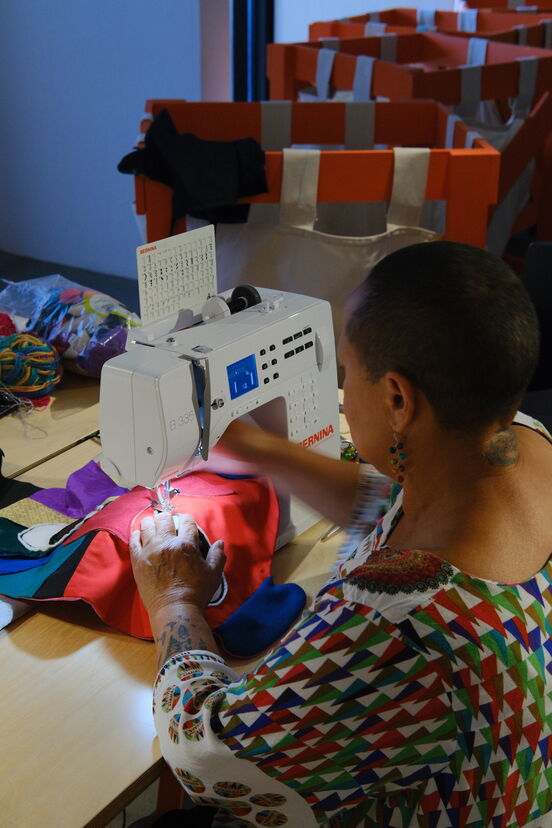 Ron Te Kawa flag making workshop, CoCA, 2021. Photographer: Aaron Kale