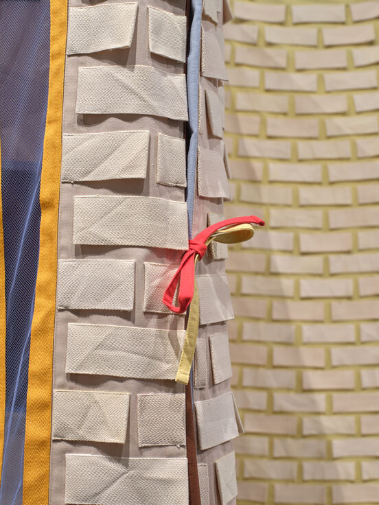 This architectural installation by Stewart is a modularised construction. Using the language of fabric – tabs, casings and plackets – each panel, Stewart has created a kit of parts for relocation.