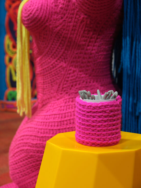 Margaret Lewis is a contemporary textile artist using traditional crafting techniques (knitting, crochet, embroidery, macrame). Her practice re-contextualises craft through the use of unexpected materials and easily found (and often discarded) items.