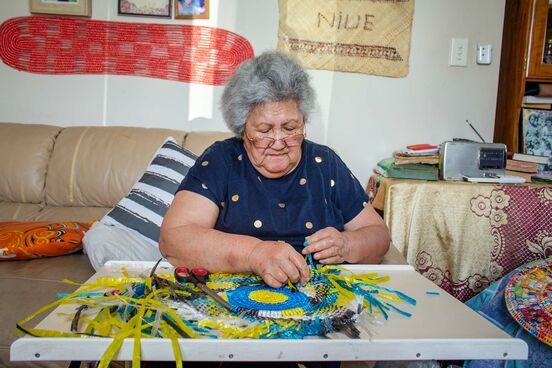 Tunaga Funaki (Nana Tu) is an artist based in Tāmaki Makaurau. She enjoys sharing her love of weaving, crochet, sewing and knitting with younger generations of the Niuean community in Aotearoa.