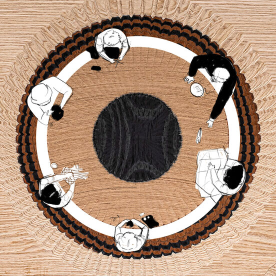Illustration by Scarlett Robinson-Kean over Martino Gamper timber sample