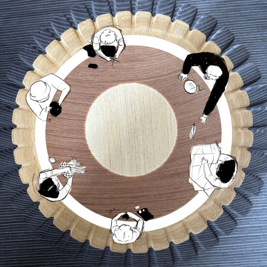 Illustration by Scarlett Robinson-Kean over Martino Gamper timber sample