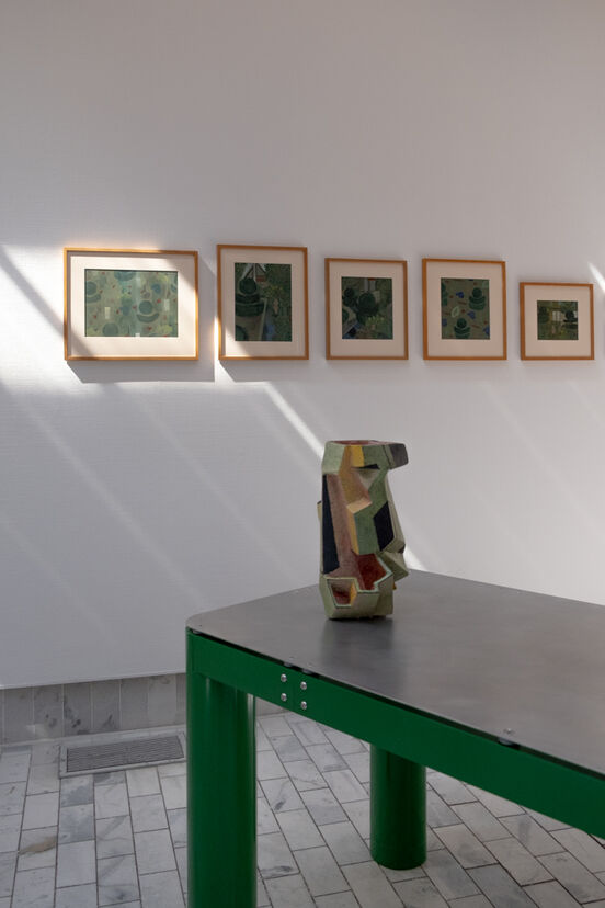 Julia Holderness, Florence Weir garden textile series, 2023, with ceramic by Cheryl Lucas on Jack Hadley table in foreground. Photograph by Natalie Bascand.
