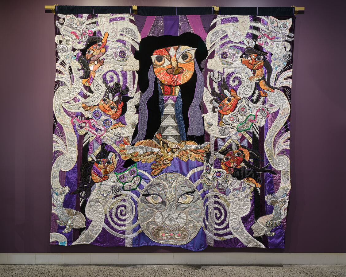 Over two decades, Te Kawa’s distinctive quilting style has explored mātauranga Māori (knowledge) and his whakapapa (genealogy) through bold colour and a tactile application of materials. Breaking the rules of traditional quilt construction, many types of fabric are masterfully stitched together to illustrate scenes from his imagination, his history and the stories of the people influential to his life.