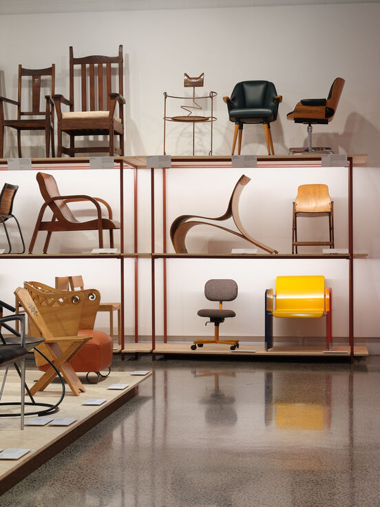 Installation view of The Chair: A story of design and making in Aotearoa, 2 Dec 2023–3 Mar 2024 at Objectspace, photograph by Sam Hartnett