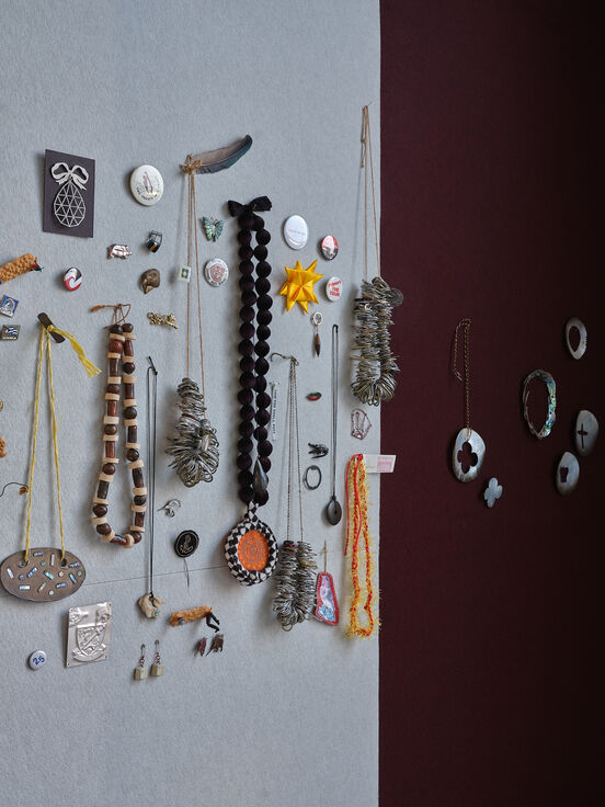 Pieces from Alan Preston's jewellery in Kātahi me ināianei / Now and then, 16 Mar–19 May 2024 at Objectspace, photograph by Sam Hartnett.