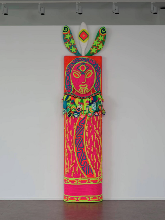 Bringing together bright, neon colours and traditional toi whakairo shapes, Wharenui Harikoa offers a new way of understanding the importance of joy and aroha within te aō Māori.