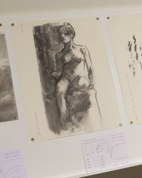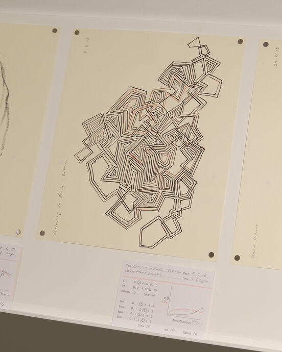 Hannah Beehre's work Excerpts from an investigation on drawing in flow, 2018 — 2019, in Mark Work at Objectspace. Photographs by Samuel Hartnett.