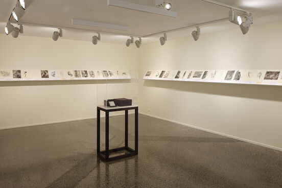 Hannah Beehre's work Excerpts from an investigation on drawing in flow, 2018 — 2019, in Mark Work at Objectspace. Photographs by Samuel Hartnett.