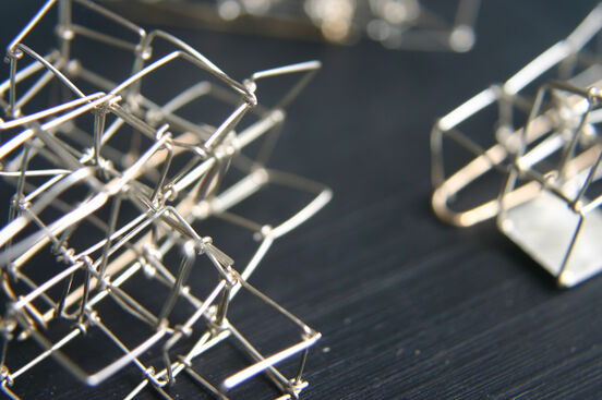 Comprising modular, often rectilinear forms, there is an unexpected softness in the way Barton's jewellery bends and adapts to the wearer's body. The artist notes that these works "resemble both the aesthetic of half finished buildings, steel skeletons exposed, and fragile spider webs with multifaceted, slightly different angles glinting."