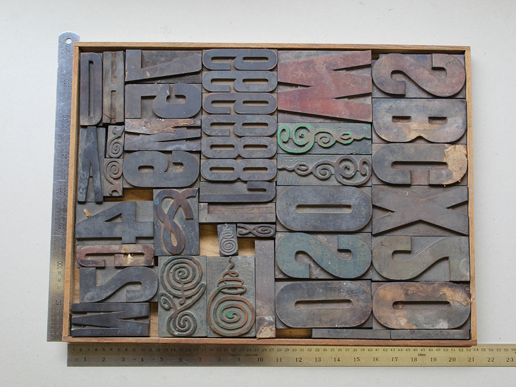 The ‘chops’ Lee incorporates here were gifted to Wai-te-ata Press by Ngan’s daughter, Liz Ngan. Lee admired the beauty of the letterpress blocks, which include hardwood forms, hand-carved by Guy Ngan, and the potential they held for play. Through her ongoing project, Lee continues Ngan’s exploration of the capacity of the forms for visual storytelling and illustration through a series of compositions made with both traditional printmaking and digital tools.