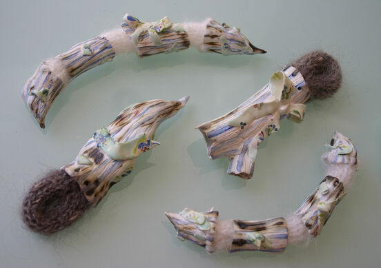 Dubrau's artificial logs of embellished porcelain and wool are objects far removed from the death and decay of nature’s cycles. In these pieces, the sophisticated and the simple are combined; visually juxtaposing the handmade with the elegant, the detailed with the awkward.