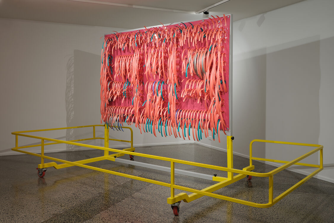 The 1988 work Duraband 10 by the late Don Driver is part of a series utilising nylon webbing as a material. With layers of vivid pink strips stitched onto plastic, the assemblage expresses Driver’s material intuition and playfulness – it’s energetic, full of life and potential movement.