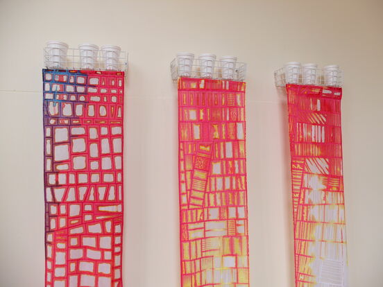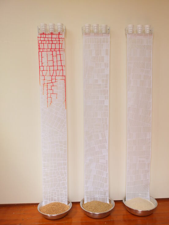 At the start of the exhibition – the hangings will be white. Coloured dye will then begin to gradually seep out from the cups and stain the fabric moving down towards the food grains in bowls below.