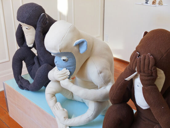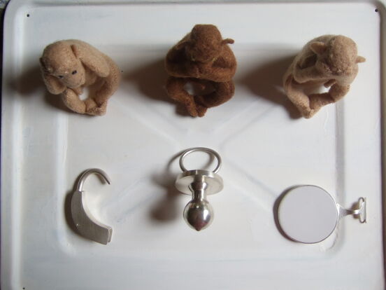 The juxtaposition of small and large is significant in Bliss, as is the use of contrasting materials such as wool and silver. Our relationship to the small, "cute" primates is different to the "friendly", life-sized companions - perfectly sized to mirror human fallibility. Similarly, our response to the soft toys contrasts with our reading of the jewellery. In these "serious" objects, mimicry has also been employed - so, although imitative at first glance, their functionality has been subverted by the artist. The artist wants us to look closely and question the hard truth of what we see. Each monkey is paired with a recognisable object made from sterling silver: a non-functional hearing aid, a pacifier, and a monocle. Although these items can be worn on the body - for some of us they demand a rethinking about the criteria used to define jewellery.