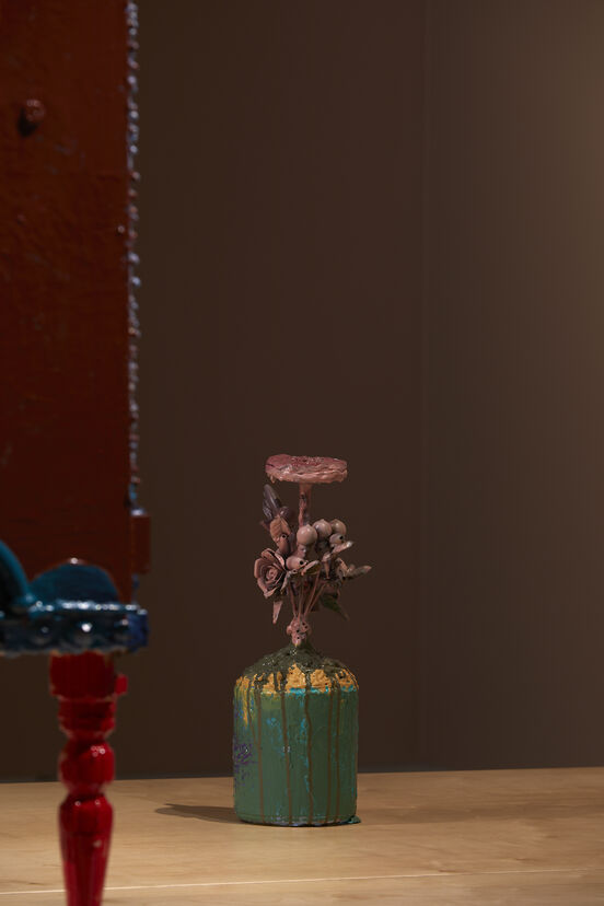 Full of abrasive colour and blinging materiality. Junk materials are repurposed new, outdated technologies find a second wind, and garish signs of opulence and wealth are discovered in surprising places. Deadweight Loss is installed within an exhibition design by architect Micheal McCabe, conceived itself of defunct exhibition furniture long since abandoned to time, and imposing on Schrijer, Steer and Fooks the exhibition’s own stylistic conventions.