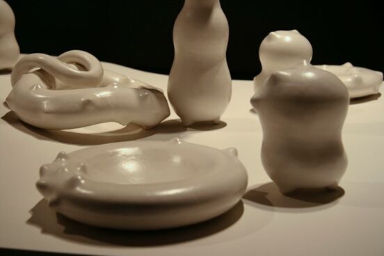 Earley states, "Domestic Disturbance engages the traditional form of the ceramic table setting to ‘set an uncanny table' for an unexpected experience. Form, appendage and surface elements come together in ways that reference domestic ware, but serve up a meal of warped, unusable forms and enclosed volumes, which fold back on themselves and push against the confines of their contained space.