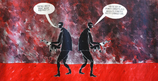 Dorothy Pauli writes that "Drapes for Real Men take on one of the most problematic aspects of Western economic success with a clear indictment of the arms industry, second only to drug dealing in terms of the profits it generates. His works then are personal reflections not only on the havoc caused by first world weapons used in third world conflicts, but also on the pursuit of profit at any price. In too many places the moral fabric of capitalism and the social structures it supports has frayed to the point of disintegration, the lure of wealth and power being too hard to resist."