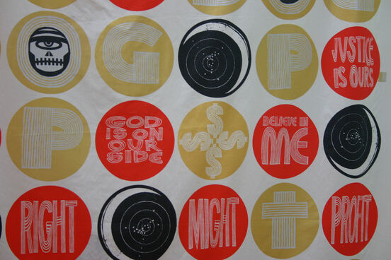 Drapes for Real Men references the traditions of textile and its functional and domestic associations, utilising printing to embellish the textile surface. The resulting textiles celebrate the handmade product but with an agenda, the content undermining the traditional expectations of what is pattern and the adornment of a domestic retreat. In this case every 'real man's' home is his bunker.