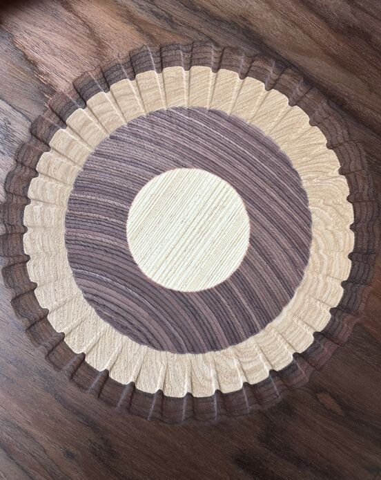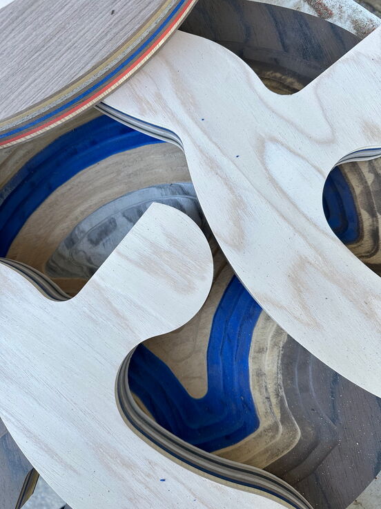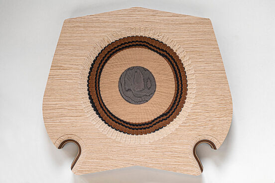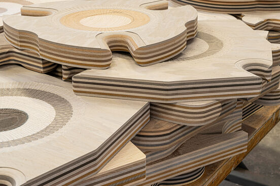 Gamper’s new body of work was produced using a timber he designed in collaboration with Italian company ALPI. The material is made from the waste stream of industrial veneer production through a process of dyeing, laminating and compressing. This gives form to a new type of human-made timber – a reimagined material that possesses a language of grain and colour not found in naturally grown timbers.