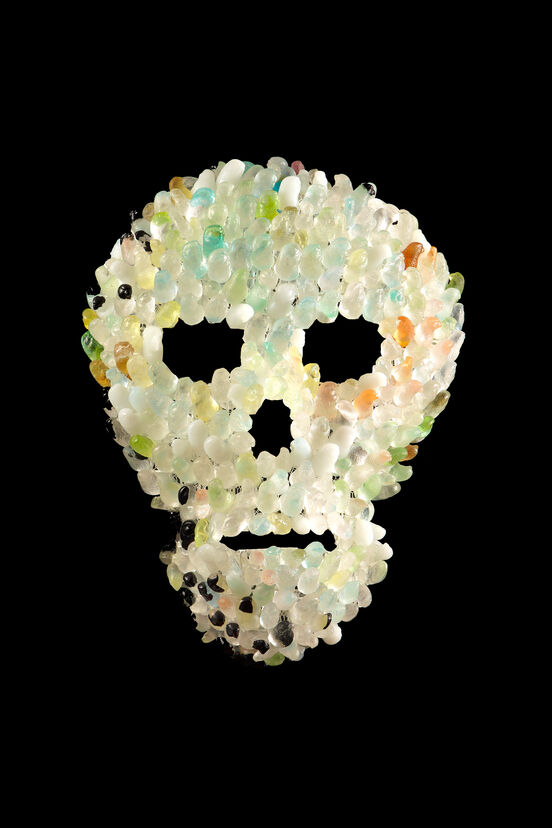 The exhibition also features works made by the Crystal Chain Gang since 2004 including an imposing chandelier, an impressive colourful flock of budgies, tūī and bellbirds and a jewelled skull named Polly. The over-sized chandelier performs as any good chandelier should, but looking a little closer you will find something unexpected. Its crystals are adorned with many press moulded glass wings with a central throat of cast-glass chicken feet, which subverts the traditional chandelier form; not quite what you would anticipate seeing suspended above your head while feasting.
