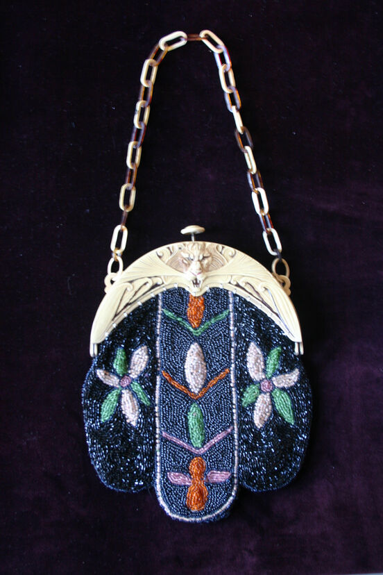 The Victorian bags and purses were either knitted or crocheted and patterns and directions for the leisured home-maker were widely available. The publication of patterns and directions was a large industry in itself. Nineteenth century bags were usually of a drawstring design however as designs became more complicated home makers could send their beaded bag away to be fitted with a rigid frame, or later on, purchase a frame to which they could fit their beading to. This collection features many bags with floral motifs: a favourite of this collector.