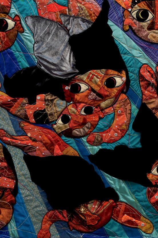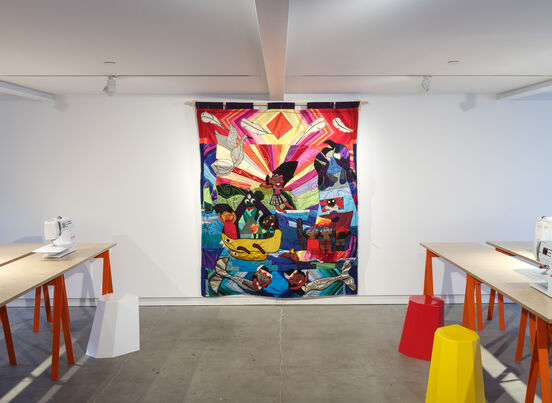 Te Kawa’s unique quilting style continually explores mātauranga Māori, his whakapapa and atua wāhine (goddesses) through bold colour and a tactile application of materials. Breaking the rules of traditional quilt construction, all types of fabric are masterfully stitched together to illustrate scenes from his imagination, his history and the stories of the people influential to his life.