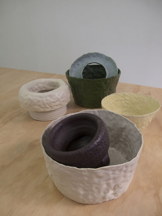 Humming on a windless slope is a continuation of a series started in 2009. Winstone explains that her concept, which relates to the tension between physical realities and the optical experience of objects was explored in two different ways. "In one series a number of basic pot forms were the subject of a perceptual encounter. Deliberately combining the processes of forming and then un-forming the pot generated 'wild' and often troubling outcomes. The process of construction and the process of deconstruction became embedded images in the work; the works rather than illustrating technical virtuosity illustrated almost the opposite; base handling concepts and the variation of these different 'modes of activity' made visible in the pots themselves."