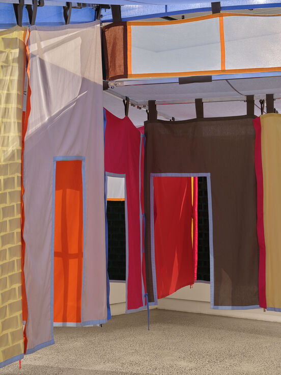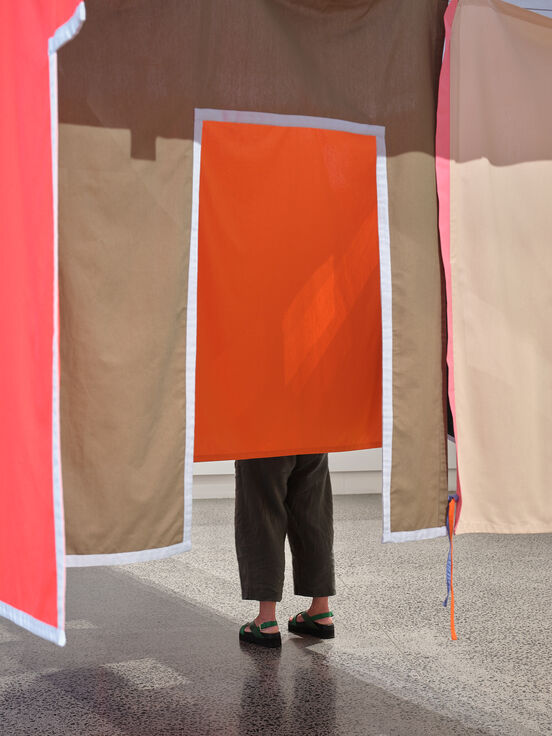 Esther Stewart lives and works in Naarm Melbourne, Australia. She creates paintings and installations that call on visual languages and concepts from architecture, design and geometry. Recently, Stewart has collaborated with architects and craftspeople to extend the spatial and material possibilities within her practice. Recent major works by Stewart exhibited in Melbourne Now at the National Gallery of Victoria, Melbourne, and in The National 4: Australian Art Now at the Art Gallery of New South Wales, Sydney.