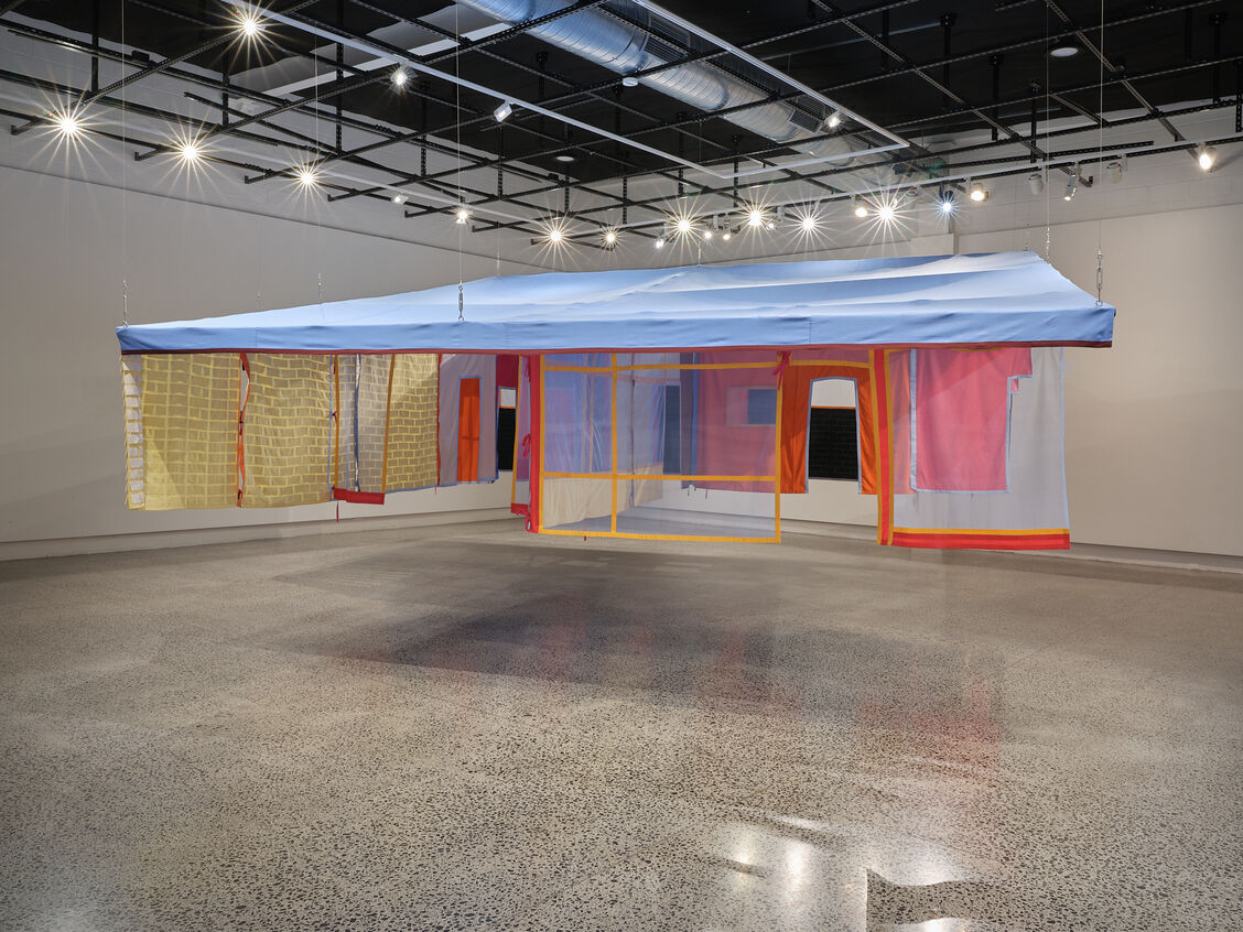 Levitating within the gallery, the soft sculpture is not a mirror or double of the Naarm building, but a herald of future possibility. Far from being neutral or static, the Emely Baker Centre and its context are continually evolving. After 10 years of dormancy, the building tentatively reopened in 2018 as a venue, available for hire via a convoluted bureaucratic system. However, given the current state of neglect and under-use, it seems the building may be the next entity to leave the gardens without trace.