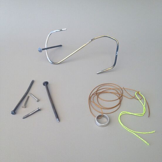 Vanessa Arthur, The golden snake and nail wall hook, 2017. One way ring; Waiting space wall hooks; 18ct yellow gold - plated in fine silver, sterling silver oxidised, brass, heat set paint, cord.