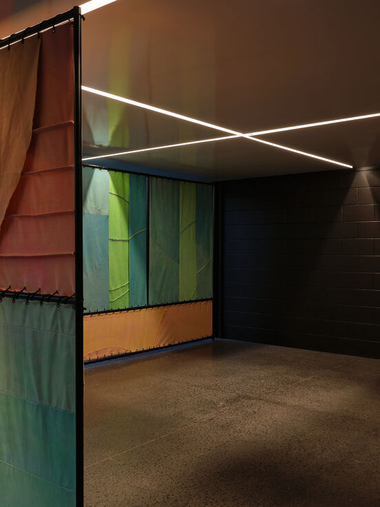 A series of dyed and layered canvas panels attached to a tubular steel structure form a new architecture for Objectspace’s courtyard plinth in Lapping at Your Door.