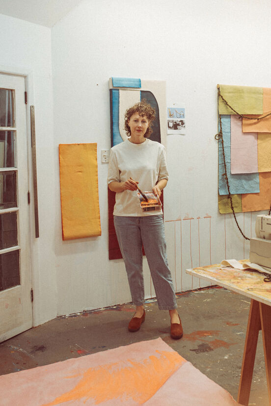 Emma Fitts’ soft architecture folds together various research threads: modernist design, the body in relation to built environments and the construction of clothing, and how queer physicality can be expressed through the collapsing of architectural space.